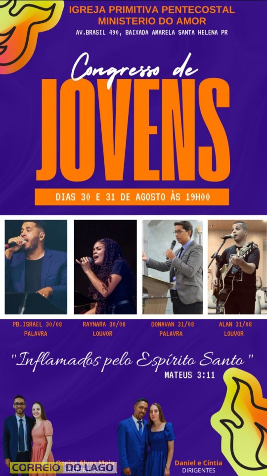 Santa Helena se prepara para receber, amanhã, dia 30, e domingo, dia 31 de agosto, o Congresso de Jovens da Igreja Primitiva Pentecostal Ministério do Amor. O evento, que ocorrerá na Avenida Brasil, nº 490, na Baixada Amarela, terá início às 19h em ambos os dias e promete movimentar a comunidade local com momentos de fé, música e reflexão.