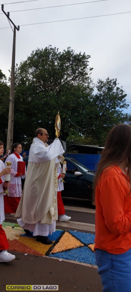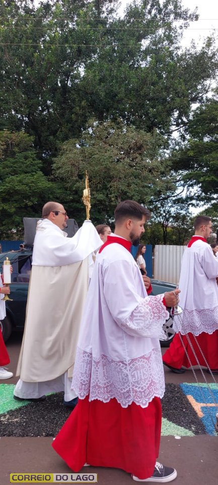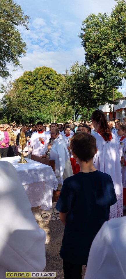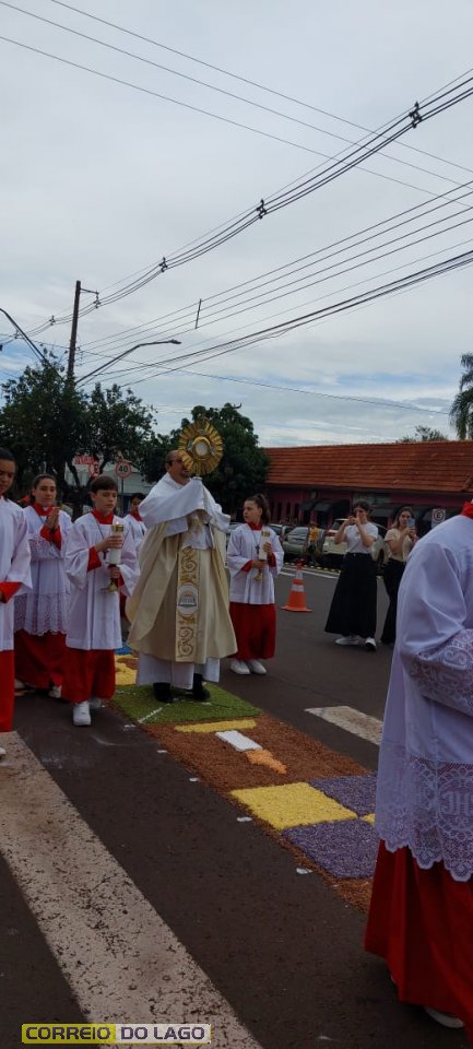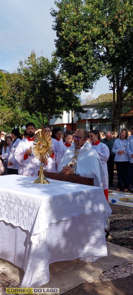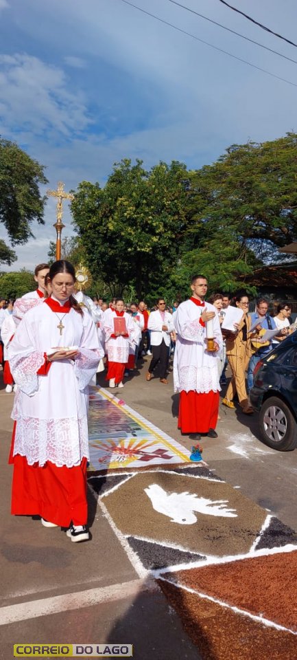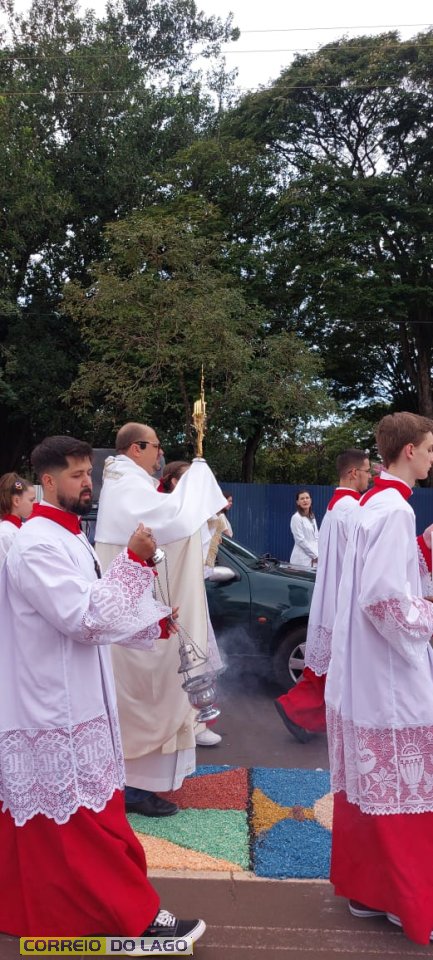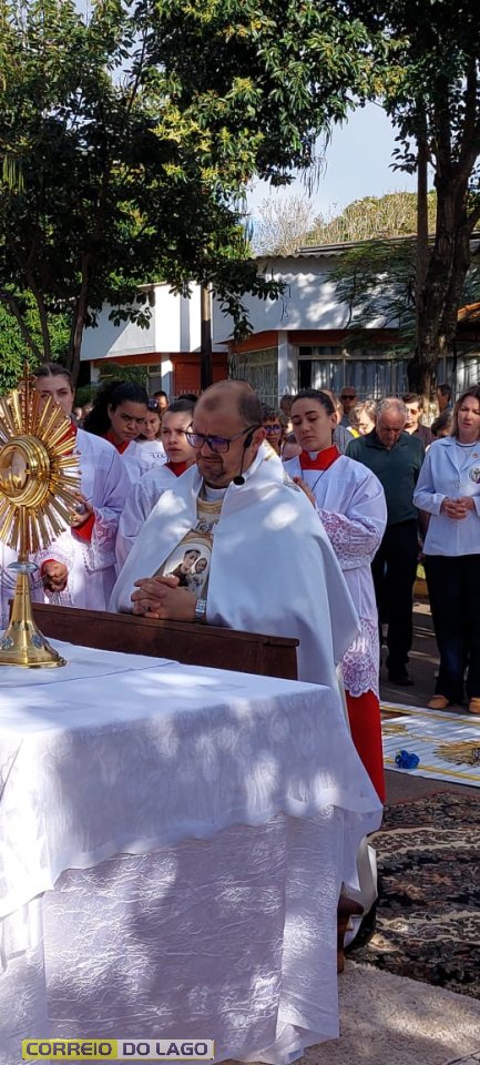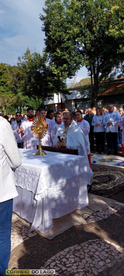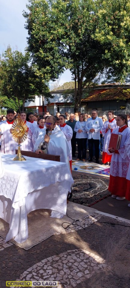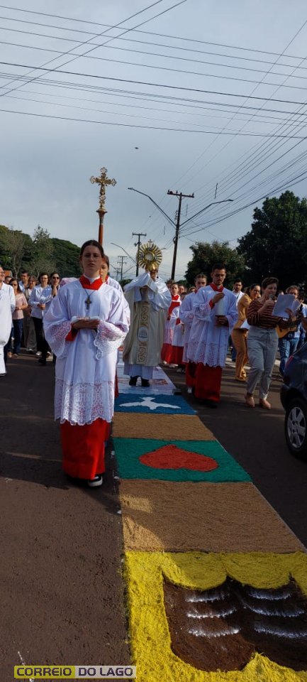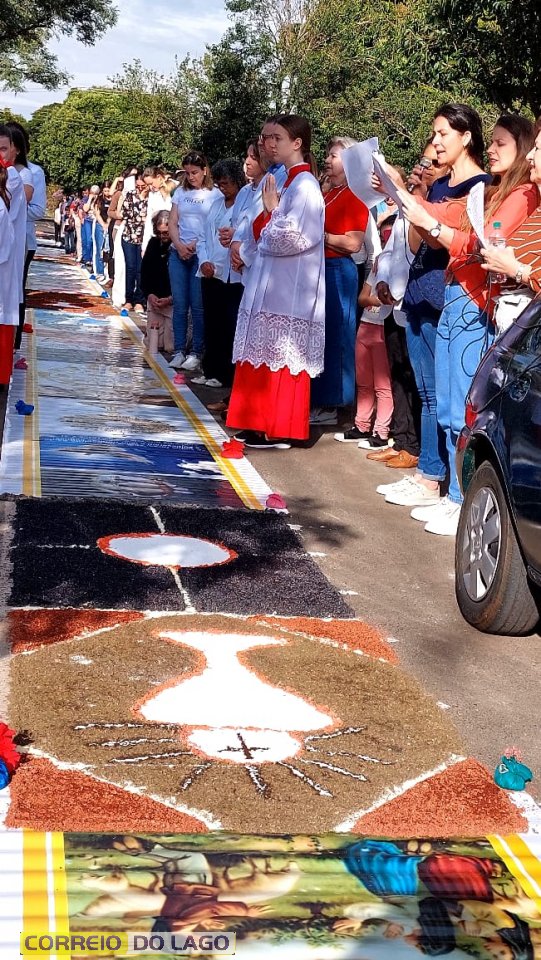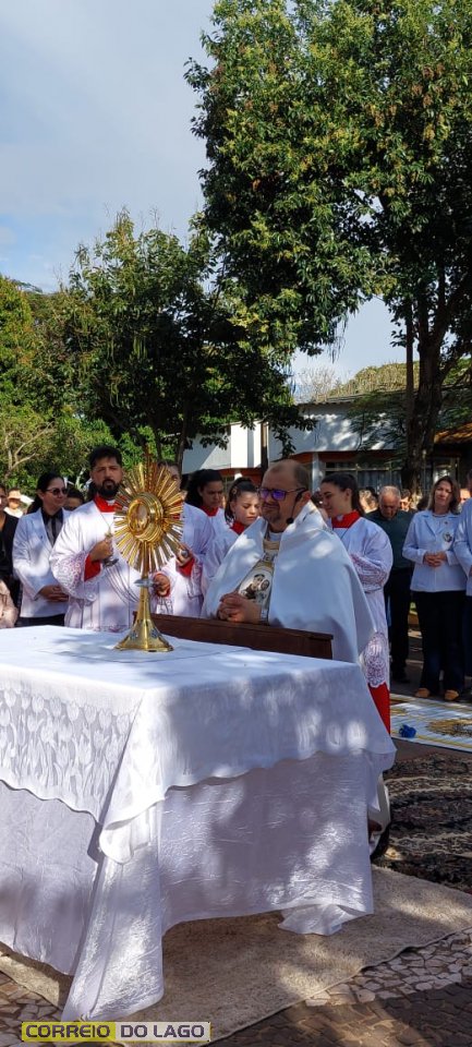 A programação religiosa contou com missa solene e, em seguida, a procissão do Santíssimo Sacramento, conduzida pelo pároco local. O percurso da procissão foi cuidadosamente decorado com os tapetes, por onde passou o ostensório com o corpo de Cristo, em sinal de reverência e comunhão com a fé católica.