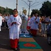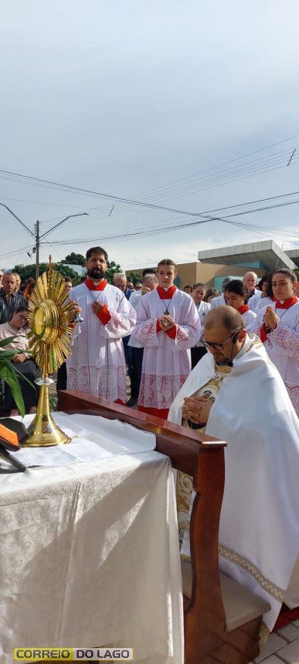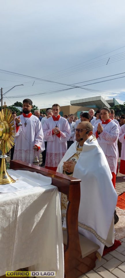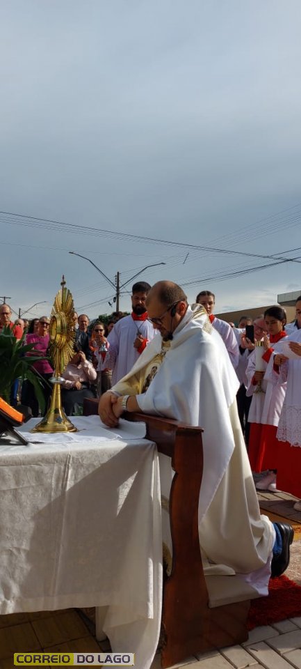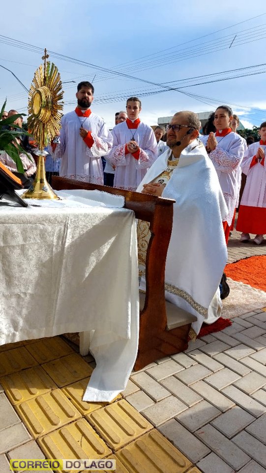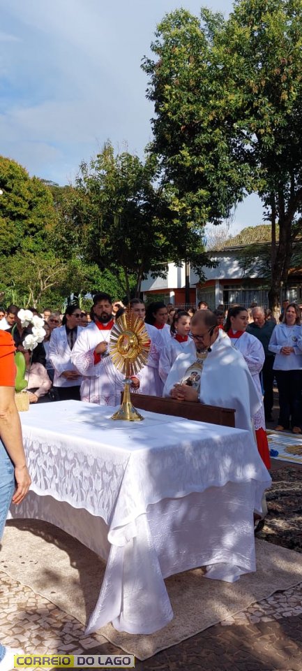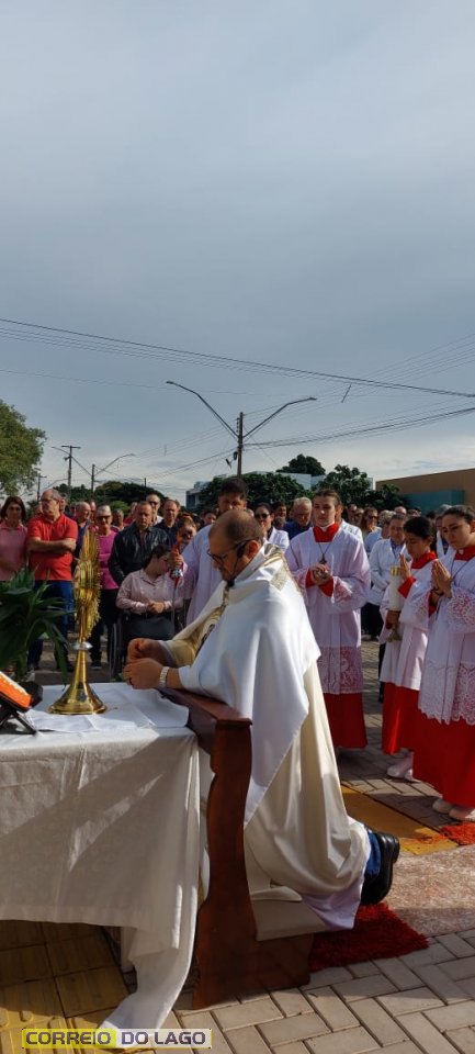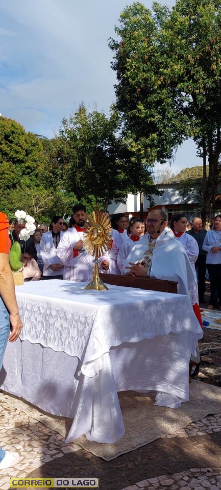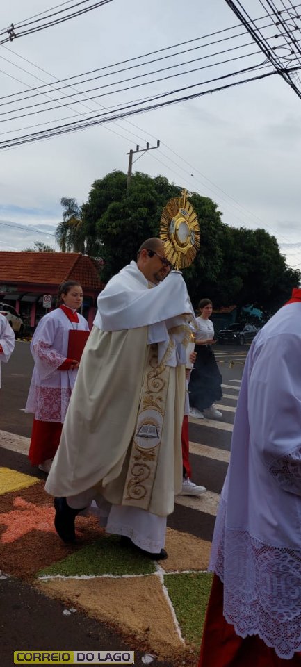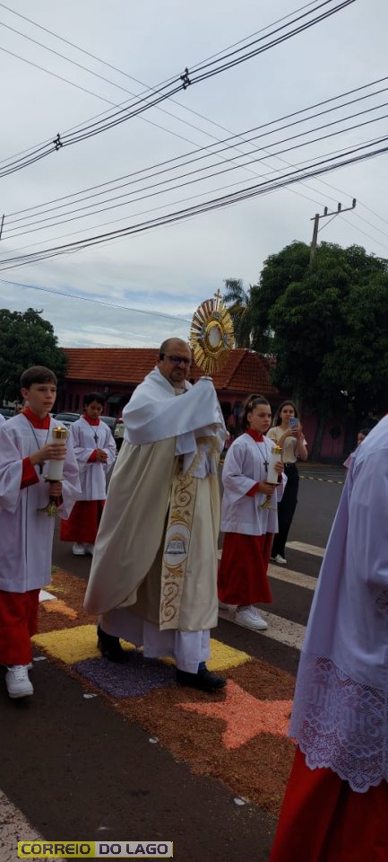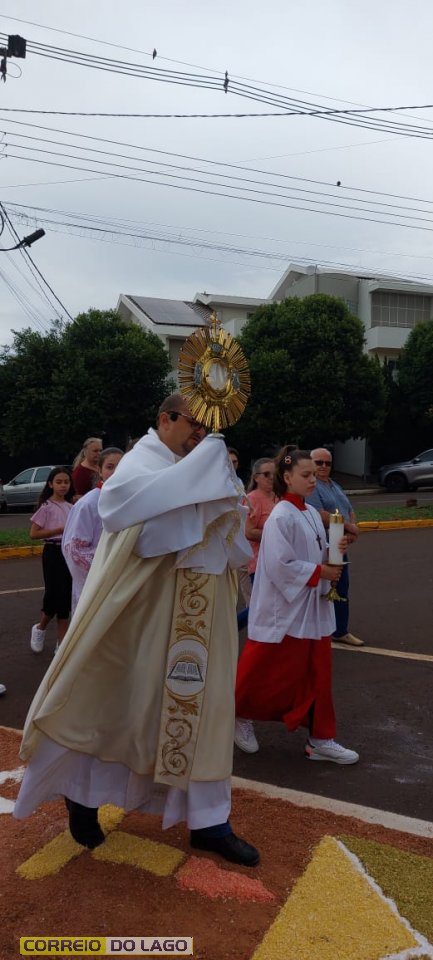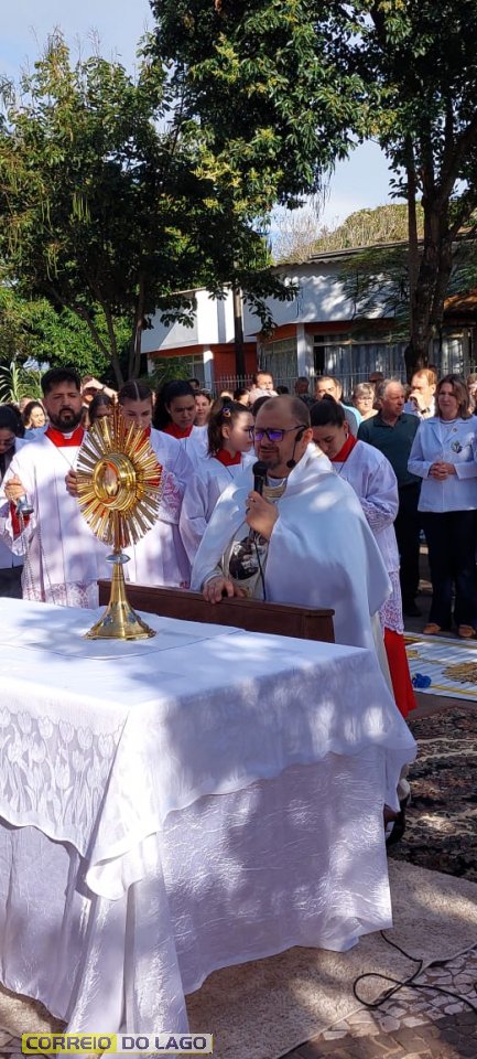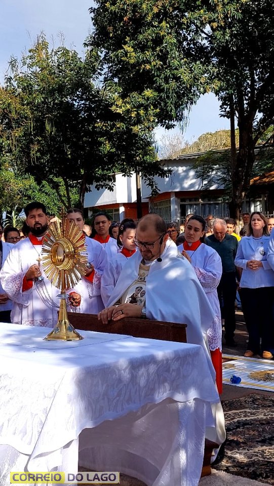 A programação religiosa contou com missa solene e, em seguida, a procissão do Santíssimo Sacramento, conduzida pelo pároco local. O percurso da procissão foi cuidadosamente decorado com os tapetes, por onde passou o ostensório com o corpo de Cristo, em sinal de reverência e comunhão com a fé católica.