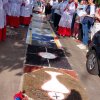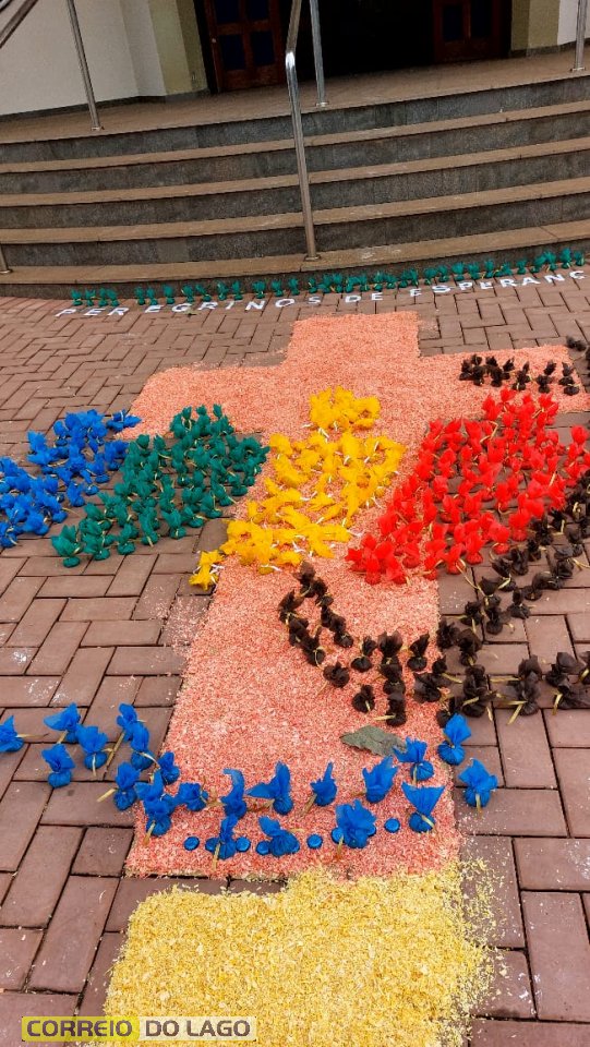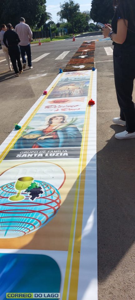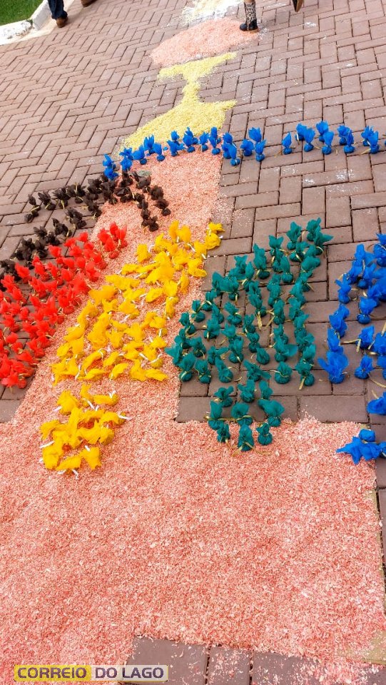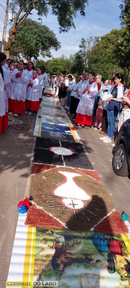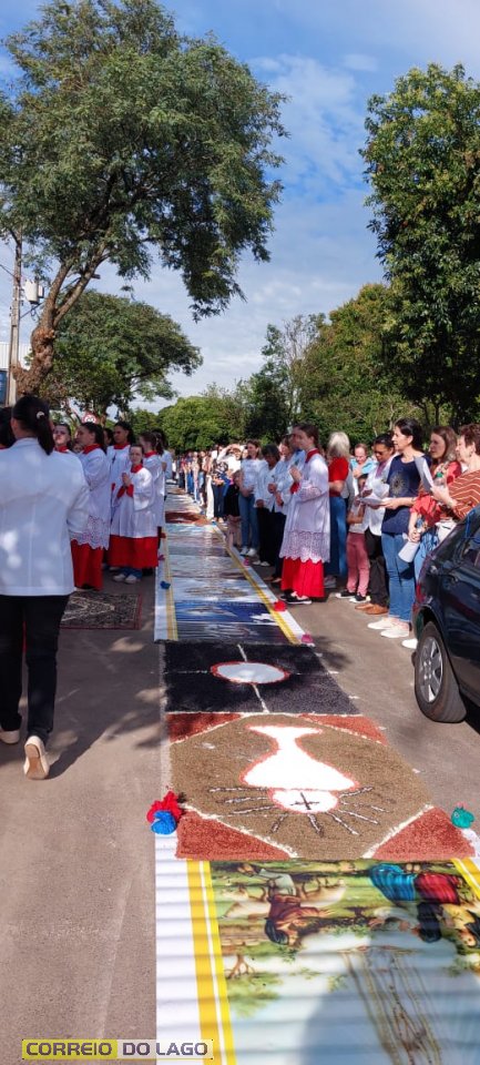 Desde as primeiras horas da manhã, grupos de famílias, catequistas, pastorais e membros da comunidade católica se dedicaram à montagem dos tapetes ao longo das ruas próximas à Igreja Matriz. Com serragem tingida, sal, tecidos, flores e outros materiais, os tapetes formaram imagens sacras, símbolos e mensagens de paz, gratidão e reflexão sobre a presença viva de Cristo na Eucaristia.