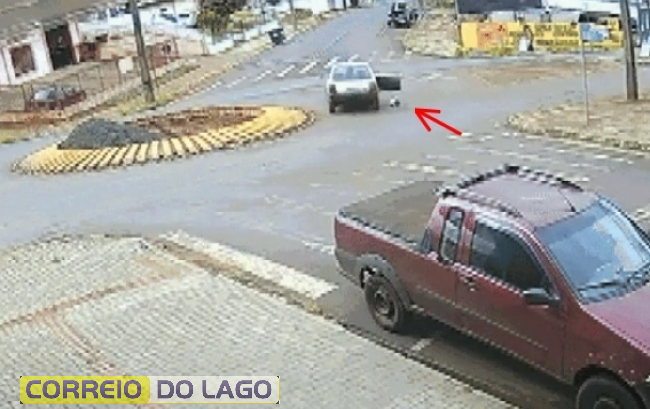 Uma câmera de segurança flagrou o momento em que uma criança pequena caiu de um carro em movimento em Pato Branco, no sudoeste do Paraná, no momento em que o veículo contornava uma rotatória. O caso foi registrado na quarta-feira (19).