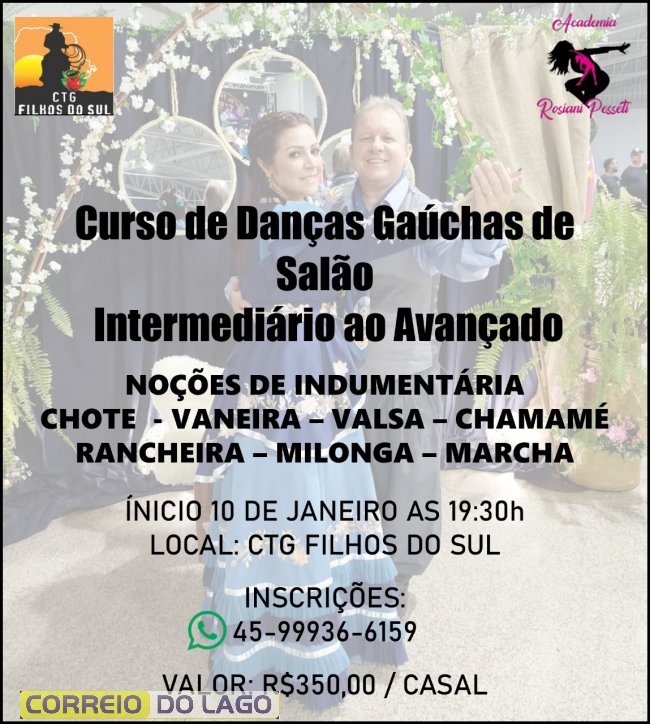 O CTG Filhos do Sul, em parceria com a Academia Rosiani Pesseti, promoverá um Curso de Danças Gaúchas de Salão voltado para níveis intermediário e avançado. O curso, que inclui noções de indumentária gaúcha e ritmos como chote, vaneira, valsa, chamamé, rancheira, milonga e marcha, terá início na próxima sexta-feira, dia 10, às 19h30.