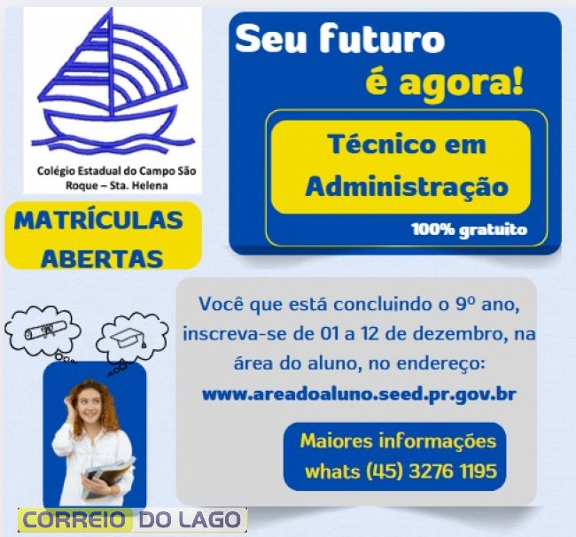 O Colégio de São Roque abriu inscrições para o Curso Técnico em Administração, voltado a alunos egressos do 9° Ano e ensino médio em Santa Helena. Com duração de três anos, o curso oferece formação teórica e prática em gestão de pessoas, finanças, marketing, logística, contabilidade, ética e empreendedorismo. Ao final, os alunos recebem diploma nacionalmente reconhecido.