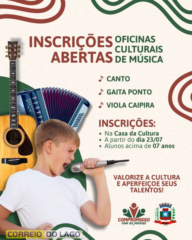 A Administração Municipal de Missal, por intermédio do Departamento de Cultura, está ofertando oficinas de música. As inscrições estão abertas e há novidades como as oficinas de Canto, Viola e Gaita Ponto. Interessados, acima dos 07 anos de idade, devem procurar a Casa da Cultura e efetuar a inscrição de forma presencial.