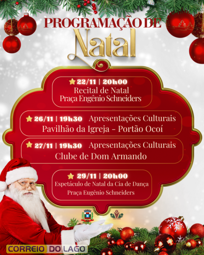 A programação de Natal em Missal terá início no mês de novembro com atrações preparadas pelo Departamento de Cultura. Estão previstas apresentações de alunos das Oficinas, tanto de música, dança e ainda um belo espetáculo unindo diversos alunos. Como nos anos anteriores, haverá programação descentralizada.