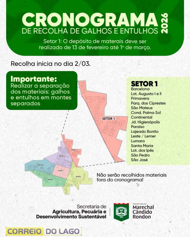 A Secretaria de Agricultura, Pecuária e Desenvolvimento Sustentável da Prefeitura de Marechal Cândido Rondon informa que o depósito de galhos, entulhos e materiais inservíveis no setor 1 deve ser feito até domingo, dia 1º. A área abrange os bairros Barcelona, Primavera, loteamentos Augusto I e II, Parque dos Ciprestes, São Mateus, Condomínio Palma Sol, Continental, Jardim Higienópolis, Paraíso, Lajeado Bonito, Leste/Lerner, Lumara, Santa Maria, Loteamento dos Ipês, São Pedro e São José.