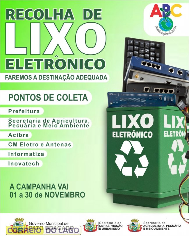 De 1 a 30 de novembro, a Secretaria de Agricultura e Meio Ambiente de Pato Bragado lança uma nova edição da Campanha de Coleta de Lixo Eletrônico. Essa ação vital tem como objetivo promover o descarte adequado de resíduos eletrônicos, protegendo nosso meio ambiente e fortalecendo a sustentabilidade na região.