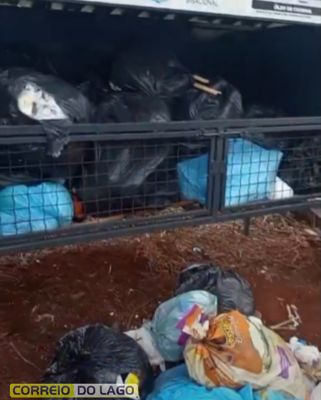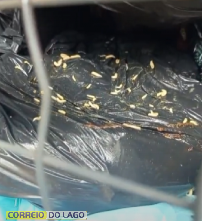 Em vídeo enviado ao Correio do Lago, os agentes mostram a gravidade da situação, incluindo a presença de larvas no lixo — consequência da mistura de materiais orgânicos com recicláveis.