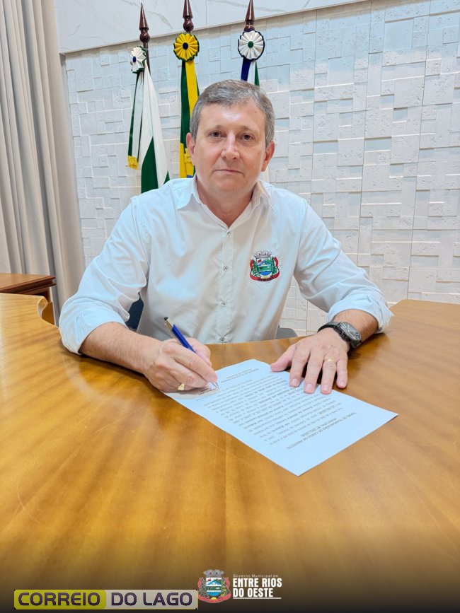 Na tarde desta terça-feira (20), a Prefeitura de Entre Rios do Oeste formalizou a transmissão temporária de cargo do Poder Executivo. O Prefeito Jair Bokorni assinou o ato de licença para férias, transferindo a responsabilidade administrativa ao Vice-Prefeito, Robson de Oliveira Lermen, que assume a função de prefeito em exercício pelos próximos dez dias.