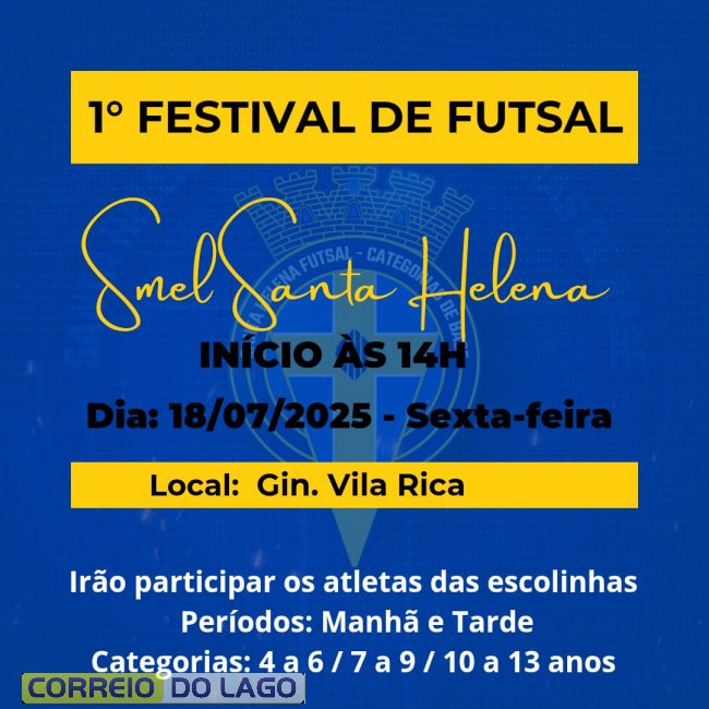 Nesta sexta-feira (18), será realizado o 1º Festival de Futsal entre as escolinhas municipais de Santa Helena. O evento reunirá crianças e adolescentes que participam das atividades esportivas nos períodos da manhã e tarde.