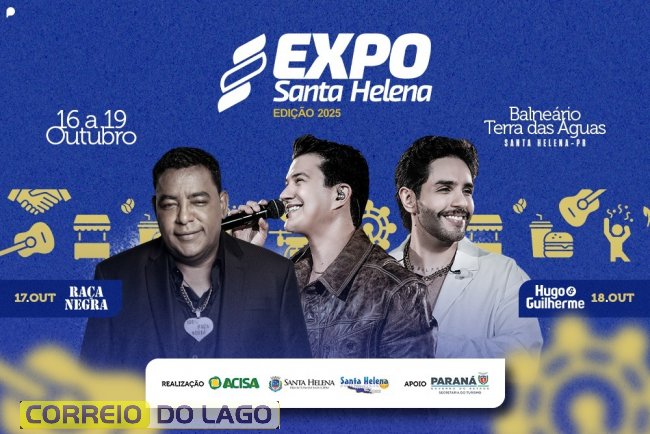 A Expo Santa Helena 2025 será realizada entre os dias 16 e 19 de outubro, no Balneário Terra das Águas, e contará com ampla programação de exposições, feira de negócios, gastronomia e apresentações culturais. Os destaques musicais são os shows de Raça Negra, no dia 17, e da dupla Hugo e Guilherme, no dia 18.