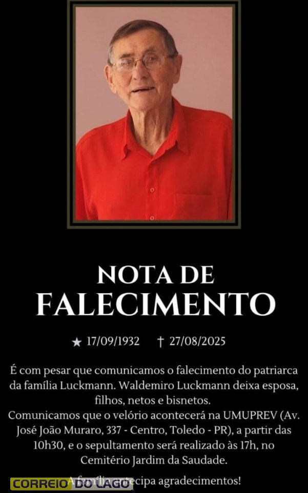 O velório está acontecendo na UMUPREV na Av. José Muraro, 33, no centro de Toledo e o sepultamento será às 17h de hoje, no Cemitério Jardim da Saudade, também naquele município. Waldemiro, deixa esposa, filhos, netos e bisnetos.