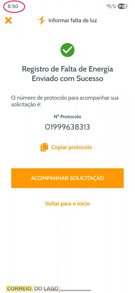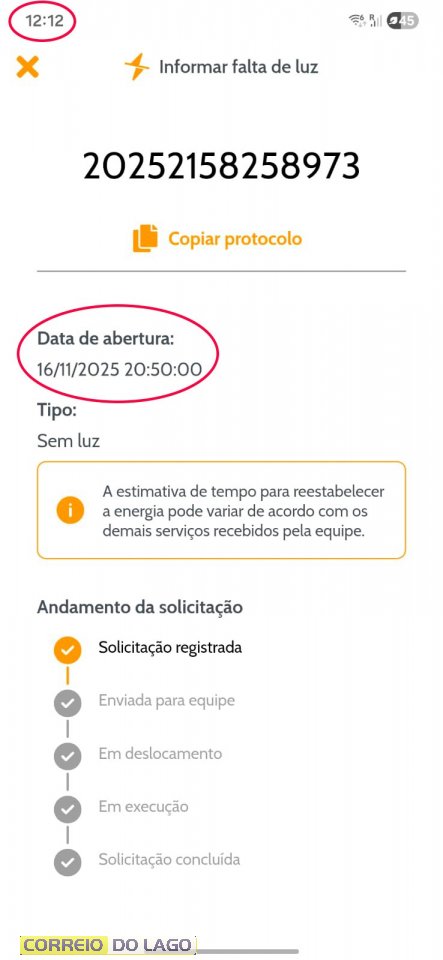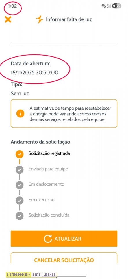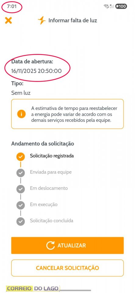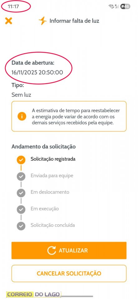 Abaixo podemos observar os horários em que os protocolos eram verificados. Inicia os 8h50min (20h50), depois quase de hora em hora, madrugada a dentro, sendo o último as 11h10, vindo a energia ser reestabelecida as 11h43min desta segunda feira (17), quase 15 horas após a interrupção.