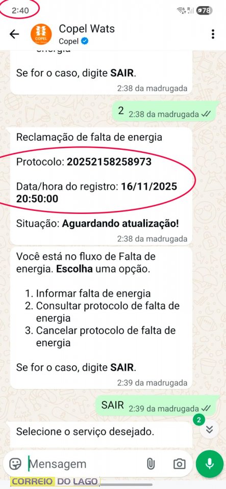 De acordo com o morador, a falta de energia foi registrada no aplicativo logo após a queda, mas o serviço não foi encaminhado para a equipe plantonista: “Não sabemos se o sistema não funciona, se não tem equipe de plantão, mas o fato é que, desde que foi privatizada, a Copel parece estar dando lucro aos acionistas”, opinou o morador.