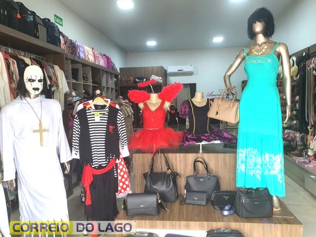 Fantasias de Halloween e moda do dia a dia em destaque na vitrine da Amore Fiori, em Santa Helena
