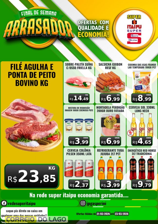 Neste sábado (21), as unidades do Super Itaipu e Super Santa Helena iniciam ofertas em carnes, itens de mercearia e bebidas com preços mais acessíveis, Final de Semana Arrasador aqui!