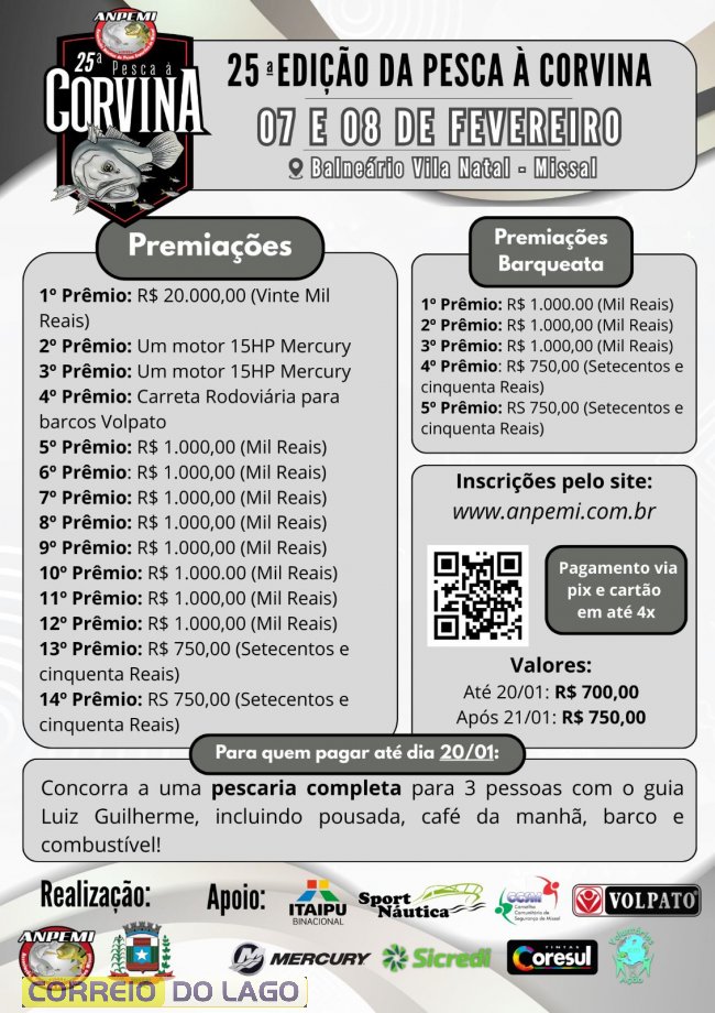 2º Prêmio: 1 diária para três pessoas, com direito a hospedagem na Pousada Grande Lago com café da manhã, embarcação e combustível, com guia Luiz Guilherme, a ser agendado pelos contemplados até o dia 15/02/2026.
