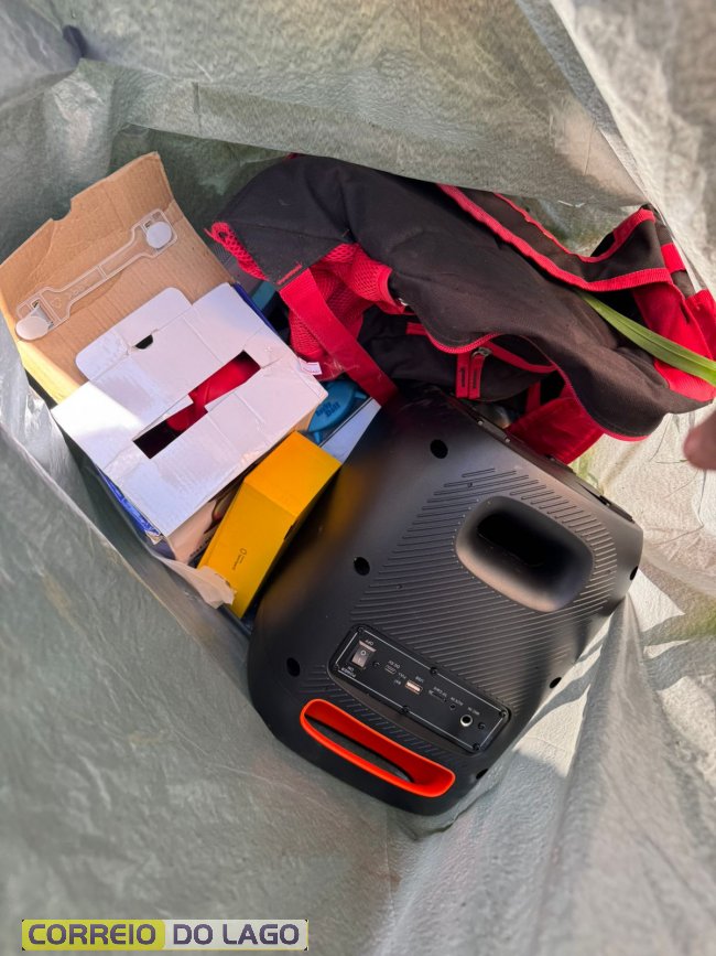 Mais tarde, por volta das 8h35, em continuidade às diligências e após análise das imagens de segurança, a equipe policial localizou os objetos furtados abandonados em uma área de mata próxima ao comércio. Entre os itens recuperados estavam caixas de som, dispositivos eletrônicos, maços de cigarro, uma mochila com luva e uma faca de serra, além de vestimentas utilizadas pelos autores. Também foi encontrado um patinete que havia sido levado no arrombamento.