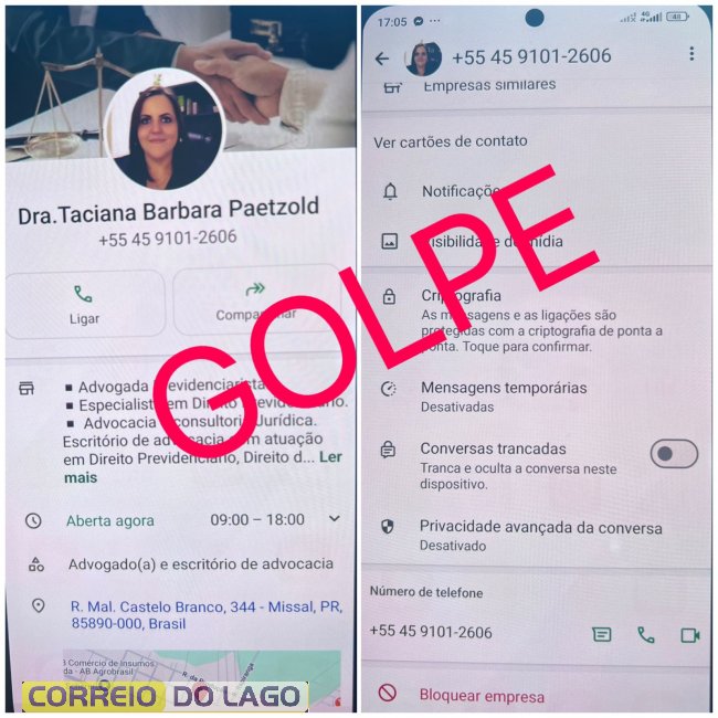 Golpistas estão se passando por advogados para aplicar golpes em moradores de várias cidades do Brasil. Em Missal, a advogada Taciana Paetzold relatou ter sido alvo da prática criminosa. Segundo ela, os estelionatários criaram um perfil falso usando seu nome e foto, e passaram a entrar em contato com clientes e familiares.
