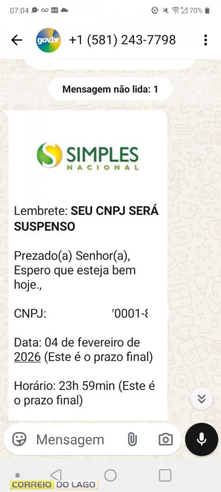 Na manhã desta quarta-feira (4), o Correio do Lago recebeu relatos de tentativas de golpe envolvendo microempreendedores individuais (MEI). Várias pessoas entraram em contato para verificar a veracidade de mensagens recebidas por WhatsApp que alertavam sobre a suposta suspensão do CNPJ.