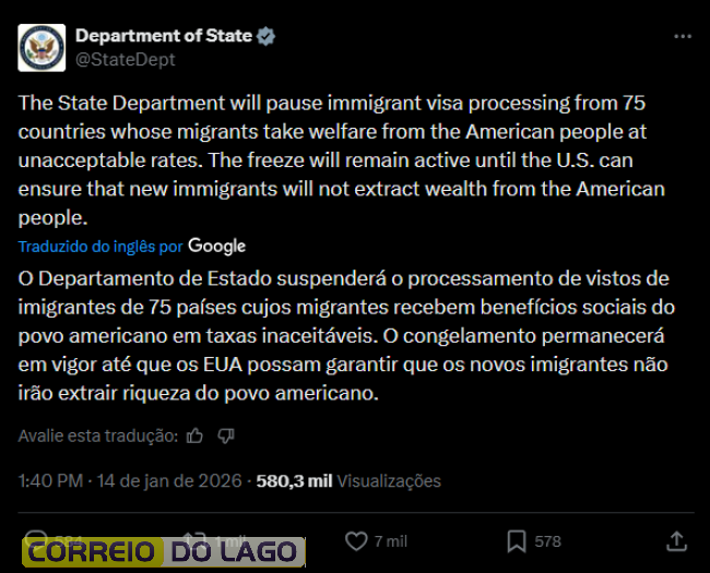 "O Departamento de Estado suspenderá o processamento de vistos de imigrantes de 75 países cujos migrantes recebem benefícios sociais do povo americano em taxas inaceitáveis. O congelamento permanecerá em vigor até que os EUA possam garantir que os novos imigrantes não irão extrair riqueza do povo americano", disse o departamento.