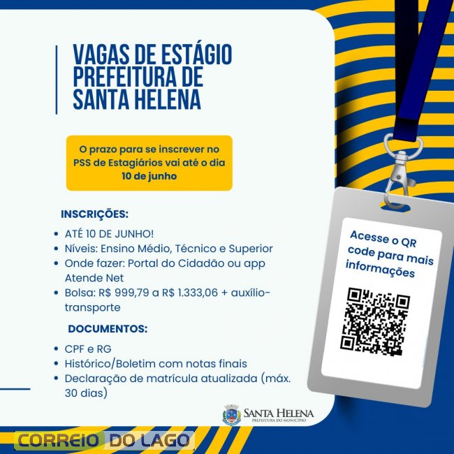 A Prefeitura de Santa Helena reforça que termina nesta terça-feira (10) o prazo para inscrições no Processo Seletivo Simplificado (PSS) de estagiários. Os cadastros devem ser realizados exclusivamente de forma digital, pelo Portal do Cidadão ou aplicativo Atende Net.
