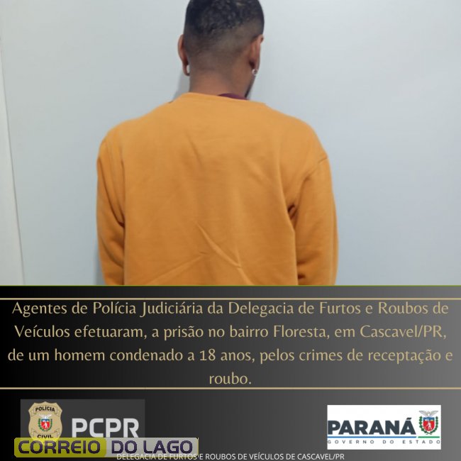 Agentes da Delegacia de Furtos e Roubos de Veículos (DFRV) de Cascavel prenderam na manhã desta quinta-feira (26), um homem que estava foragido da justiça, condenado a 18 anos de prisão pelos crimes de roubo e receptação. A prisão ocorreu no bairro Floresta, em uma operação que reforça o trabalho contínuo das forças de segurança no combate à criminalidade na região.