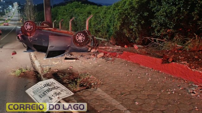 Desgovernado, o carro subiu na calçada, colidiu com uma placa de sinalização e rompeu a cerca de arame de uma propriedade privada. Em seguida, capotou, parando com as rodas voltadas para cima e ficando a poucos metros de um poste de energia elétrica.