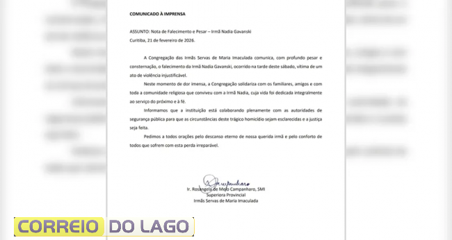 Na sequência, a PM conseguiu localizar e prender o suspeito nas imediações, no momento em que ele tentava fugir. O homem foi encaminhado para a delegacia local, onde o caso segue sob investigação para apurar todas as circunstâncias e a motivação exata do assassinato. O corpo de Irmã Nadia foi recolhido e levado ao Instituto Médico Legal (IML) de Ponta Grossa.