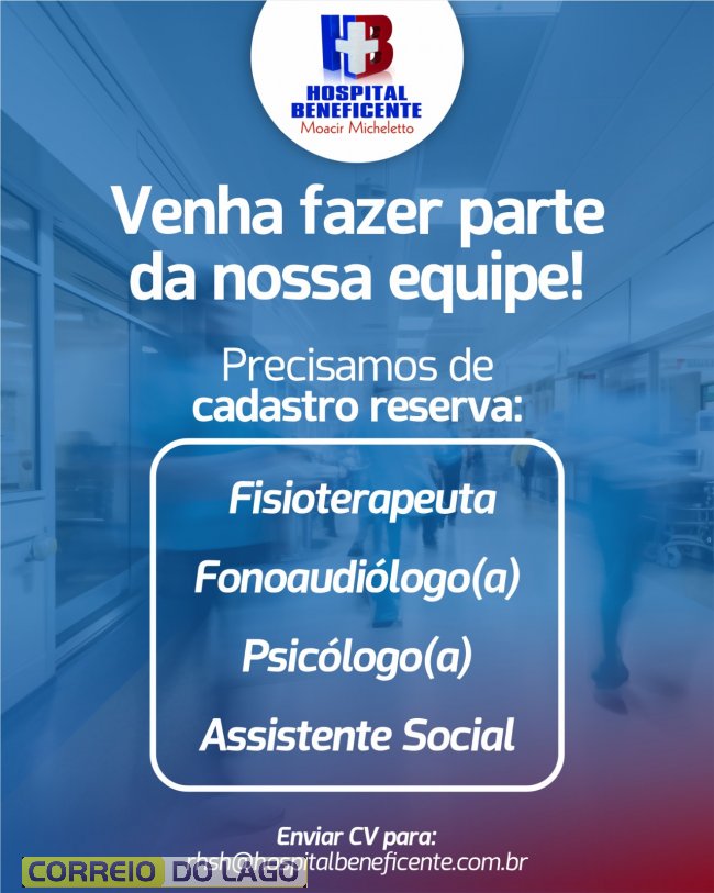 O Hospital Beneficente Moacir Micheletto, em Santa Helena, está recebendo currículos para compor cadastro reserva em diferentes áreas. As oportunidades abrangem funções de fisioterapeuta, fonoaudiólogo(a), psicólogo(a) e assistente social.