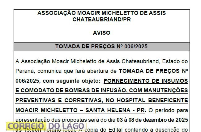 A Associação Moacir Micheletto de Assis Chateaubriand, comunica que fará abertura de TOMADA DE PREÇOS Nº 006/2025, com seguinte objeto: FORNECIMENTO DE INSUMOS E COMODATO DE BOMBAS DE INFUSÃO, COM MANUTENÇÕES PREVENTIVAS E CORRETIVAS, NO HOSPITAL BENEFICENTE MOACIR MICHELETTO – SANTA HELENA - PR.