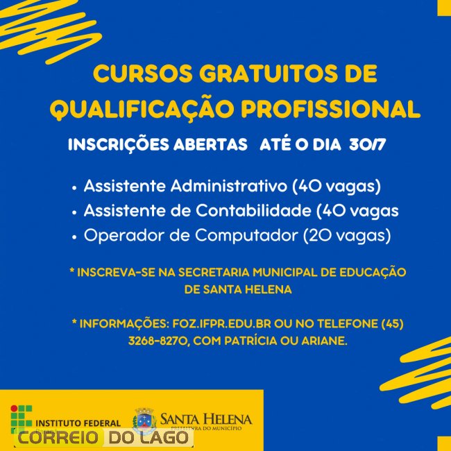 O Instituto Federal do Paraná (IFPR), em parceria com a Prefeitura de Santa Helena, está com inscrições abertas para três cursos gratuitos de qualificação profissional. A iniciativa visa ampliar as oportunidades de capacitação para a população, promovendo o desenvolvimento pessoal e profissional dos participantes.