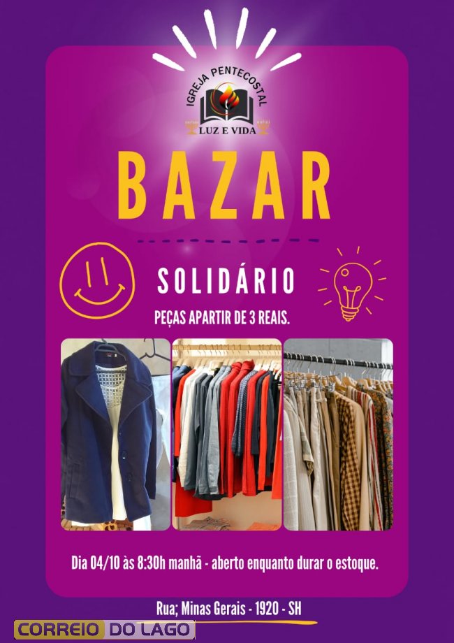 A Igreja Pentecostal Luz e Vida, localizada na Rua Minas Gerais, 1920, em Santa Helena, promoverá um bazar solidário no dia 4 de outubro, a partir das 8h30.