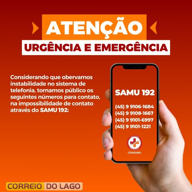 O Serviço de Atendimento Móvel de Urgência (SAMU) informa que o telefone 192 está passando por instabilidades temporárias, o que pode dificultar o contato da população em situações de urgência e emergência. Diante disso, enquanto o problema não é totalmente normalizado, a orientação é que os atendimentos sejam acionados pelos números alternativos:
