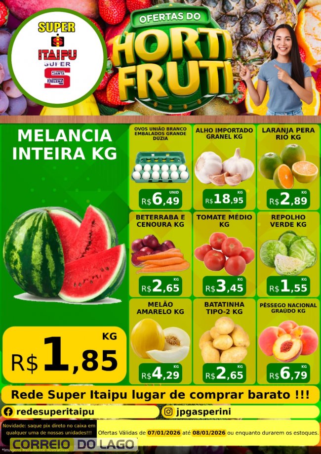 O mês de janeiro já inicia com economia garantida no Super Itaipu e no Super Santa Helena. Nesta quarta-feira (07), os clientes encontram ofertas especiais em diversos produtos. É a oportunidade ideal para abastecer a despensa e iniciar o mês pagando menos. As ofertas são válidas para esta quarta-feira (07) e quinta-feira (08), ou enquanto durarem os estoques.