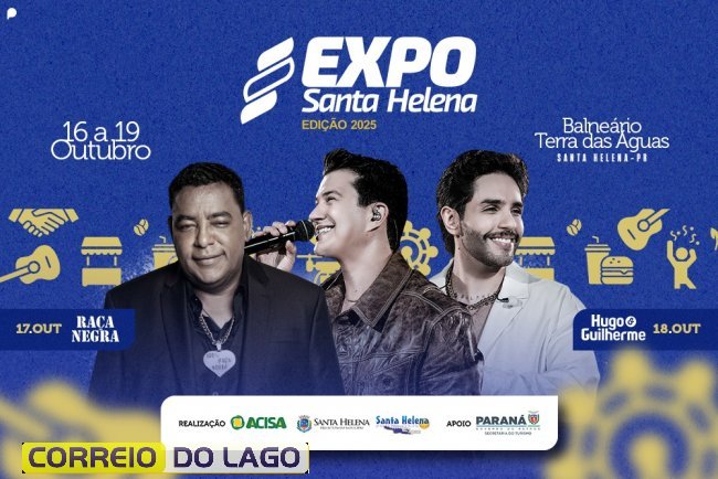 ➡️ A Prefeitura de Santa Helena confirmou shows da Expo Santa Helena 2025: Raça Negra se apresenta em 17 de outubro e Hugo e Guilherme no dia 18, ambos às 23h. O evento ocorre de 16 a 19 de outubro no Balneário Terra das Águas, com detalhes de ingressos e programação a serem divulgados pela Administração Municipal e Acisa.