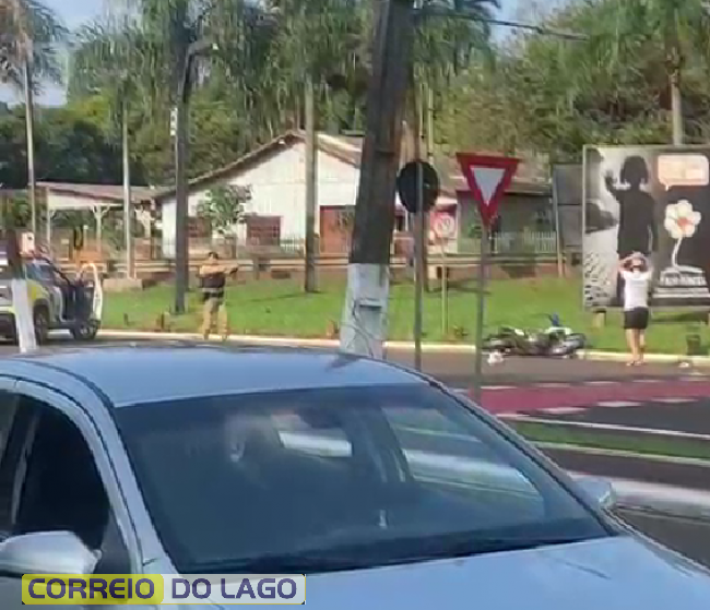 Jovem motociclista não respeita abordagem policial e é derrubado pela viatura na avenida Brasil, em Santa Helena