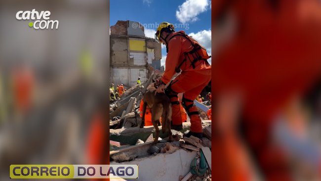 Mais de 50 bombeiros trabalham na operação com apoio de cães de busca para localizar possíveis sobreviventes.