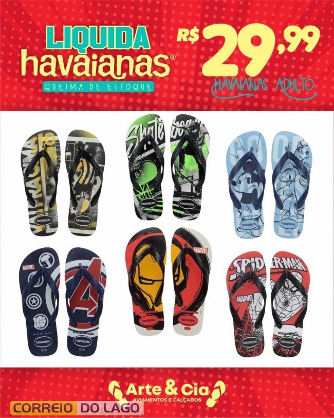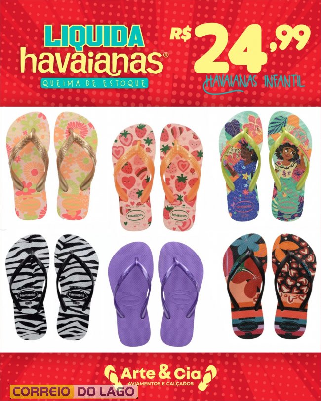 A Arte&Cia segue com a liquidação de Havaianas e conta com alguns modelos disponíveis para atender à procura dos últimos dias. A campanha continua com preços reduzidos e opções para diferentes estilos e idades.
