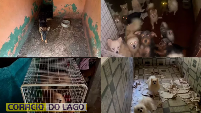 As investigações apontaram que os animais, das raças Spitz Alemão, Yorkshire e Pastor Alemão, viviam em gaiolas, onde permaneciam em meio a fezes e urina, sem acesso à água ou comida.