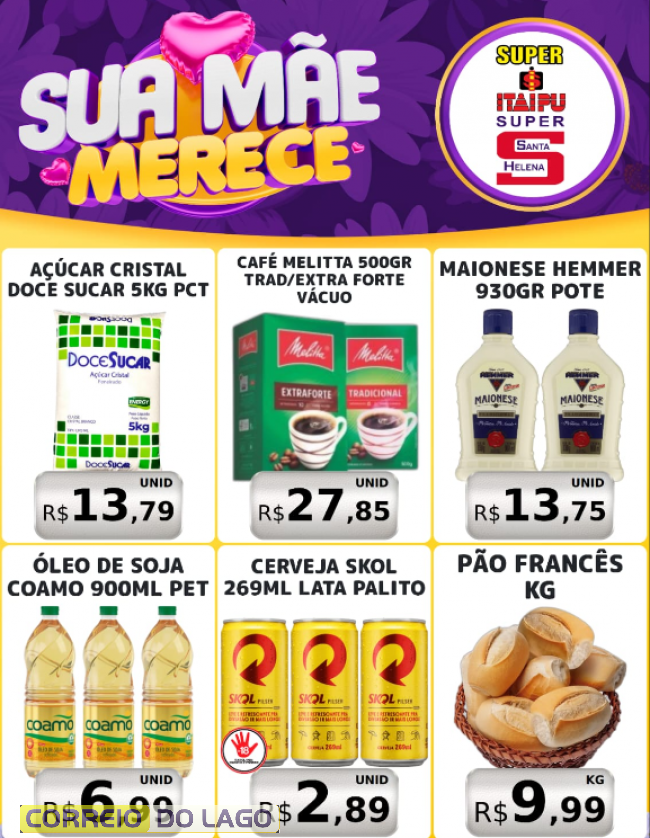 Nesta quarta-feira (29), o Super Itaipu e o Super Santa Helena realizam a campanha "Sua mãe merece", com variedade de produtos para o dia a dia. Com preços acessíveis, facilitando as compras com opções práticas e econômicas para toda a semana.
