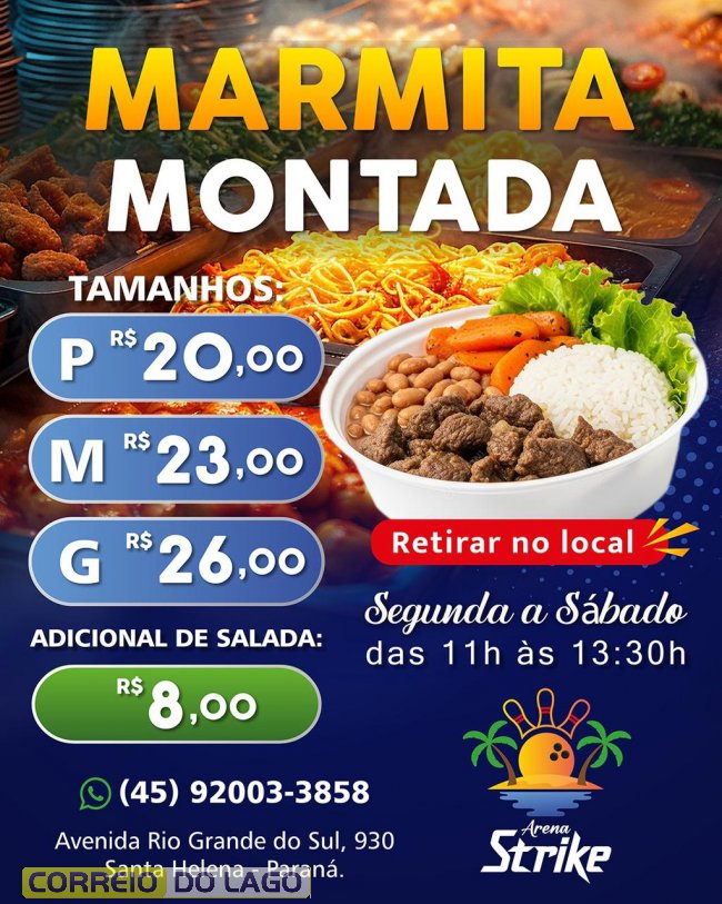 Quem busca praticidade no horário de almoço encontra no Arena Strike, em Santa Helena. O espaço oferece marmita montada com retirada no local, ideal para quem quer comer bem sem perder tempo.