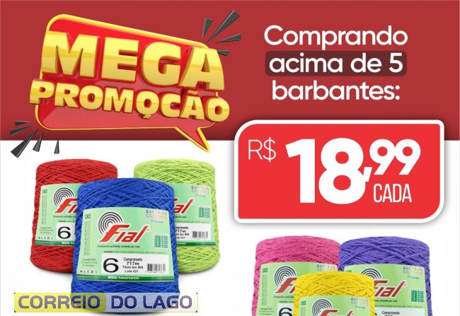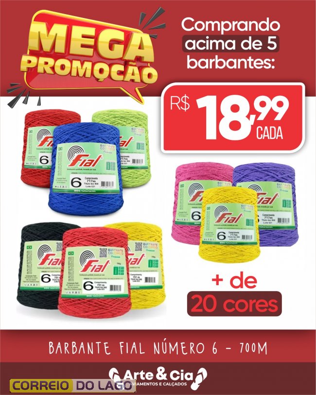 A Arte&Cia em Santa Helena lançou uma promoção que facilita a compra de barbantes para artesanato. O barbante Fial número 6 de 2 kg está disponível por R$ 49,99 na compra de uma unidade e cai para R$ 44,99 ao adquirir quatro ou mais.