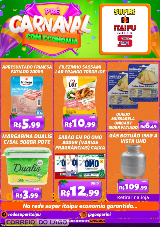Nesta quinta-feira (12), o Super Itaipu e o Super Santa Helena realizam ofertas especiais das campanhas Pré-Carnaval com Economia e Quinta na Feira, com preços reduzidos no hortifrúti, frios, mercearia e itens básicos do dia a dia. As promoções são válidas apenas hoje ou enquanto durarem os estoques.