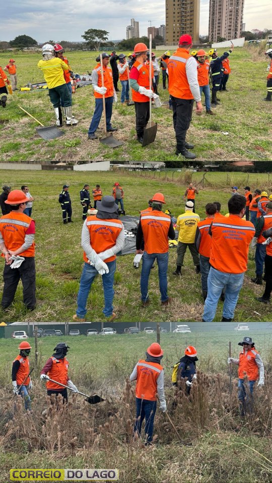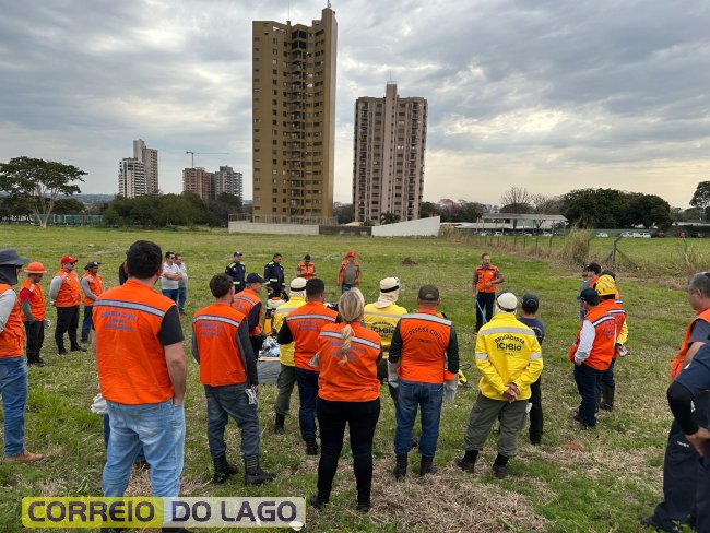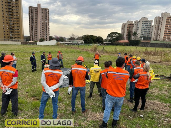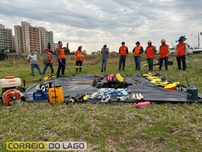 Pela manhã, as instruções aconteceram no auditório do 9° BBM. À tarde, os participantes foram a campo, na Avenida Pedro Basso, para um exercício prático de combate a incêndio florestal.