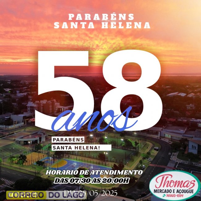 A equipe do mercado Thomas parabeniza o município por este importante marco histórico e pelo desenvolvimento constante durante estes 58 anos e também convida você para aproveitar o feriado municipal para fazer suas compras com tranquilidade e economia.