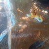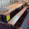 Entre os destaques está uma mesa inteiriça de aproximadamente três metros de comprimento, confeccionada em madeira de pequiá. O modelo chama a atenção pelo design robusto, no qual a própria madeira faz o arredondamento e forma o pé de um dos lados, valorizando o aspecto natural da peça.