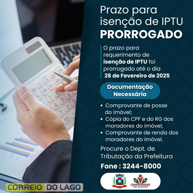 A Prefeitura de Missal publicou o Decreto nº 6.314, de 31 de janeiro de 2025, prorrogando o prazo para os contribuintes solicitarem a isenção do IPTU para o exercício de 2025. Agora, os moradores que se enquadram nos critérios estabelecidos pelo Artigo 185 da Lei Municipal nº 1.552/2020 terão até o dia 28 de fevereiro de 2025 para fazer o requerimento.