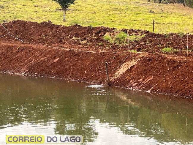 Segundo o morador, a transferência de água entre dois açudes localizados em sua chácara é feita por meio de um sistema simples, baseado em princípios da física. Ele utiliza uma mangueira que liga os dois reservatórios, sendo que o açude que fornece a água está situado em um ponto mais elevado. Dessa forma, a água escoa por gravidade para o segundo açude, sem a necessidade do uso de bombas.