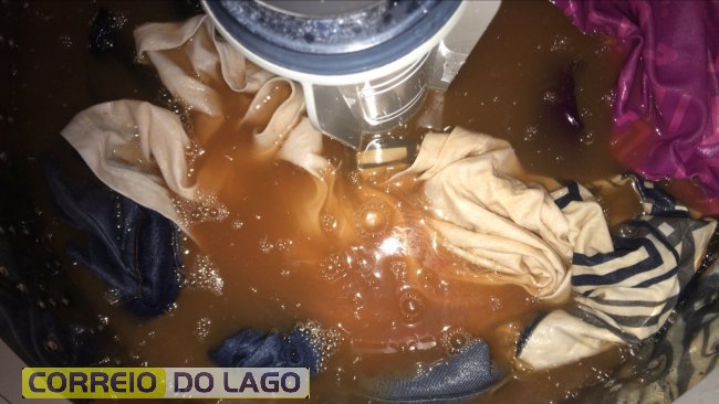 Imagens enviadas ao Correio do Lago mostram a água saindo da torneira totalmente imprópria para o consumo. Todas as roupas lavadas durante o episódio ficaram muito sujas e a moradora pode ter que descartá-las.